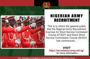 TheNigerian Army, invites eligible Nigerians to apply into the Nigerian Army’s Short Service Combatant Course and Direct Short Service Commission Course, which is opened to both civilians (non military) and serving military personnel.
