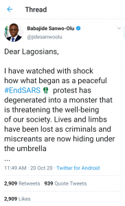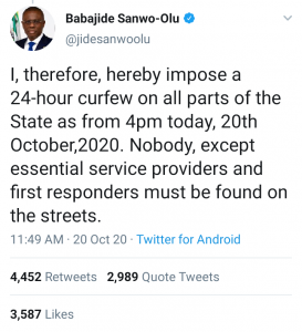 The Governor of Lagos State, Babajide Sanwo-olu, has impose a 24-hour curfew on all parts of the State to begin from today, 20th October, 2020 by 4pm.